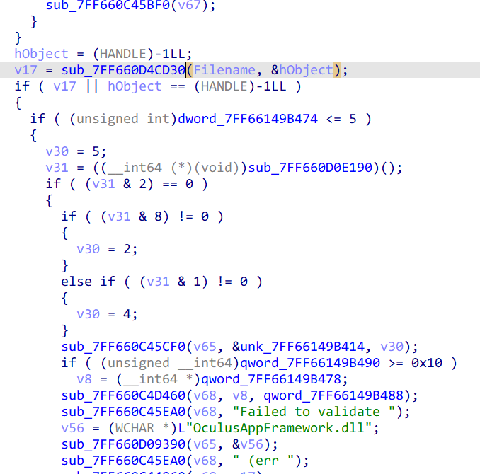 尝试通过 IDA 在输出部分进行修改绕过一下 IF 的执行,发现并没有用。而且当修改了 OVRServer_x64.exe,服务启动器也会拒绝启动它。于是我就想能不能通过 Hook 或者别的什么方法解决这个问题